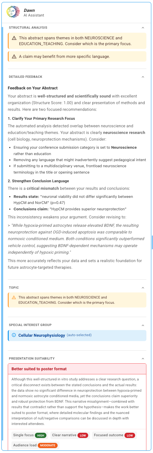 That's up to you. Some conferences only need a light touch - a check for major problems, topic classification, a sense of what's coming in. Dawn handles that comfortably on its own. Other events have a rigorous review process, and Dawn works alongside it, spotting submissions that need a closer look as they come in, not weeks later. Dawn does the groundwork so your reviewers can focus on what actually needs their attention.